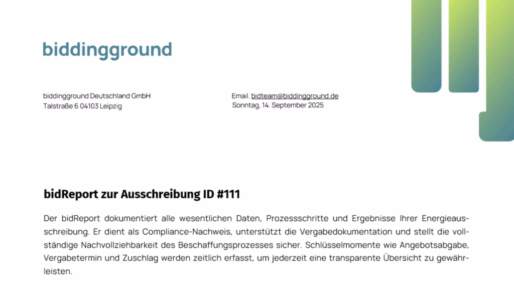 Viele Eigentümer legen heute großen Wert auf eine nachvollziehbare und transparente Vergabeentscheidung. Hausverwaltungen stehen damit in der Pflicht, nicht nur günstig einzukaufen, sondern auch gerichtsfest nachzuweisen, dass mehrere Angebote eingeholt und objektiv bewertet wurden. biddingground bietet hierfür den bidReport – eine revisionssichere und rechtlich belastbare Dokumentation des gesamten Ausschreibungsprozesses, inkl. Angebotsübersicht, Bewertungskriterien und Zuschlag.